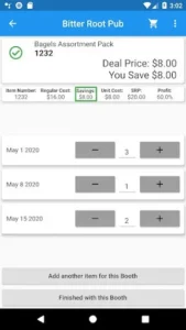 - Navigate Vendor Booths & Place Orders: Browse through vendor booths, select a booth to view its product offerings, and tap on an item to adjust the quantity for each ship date. If managing multiple locations, use the “Apply to All” option to assign the same quantity across all locations.